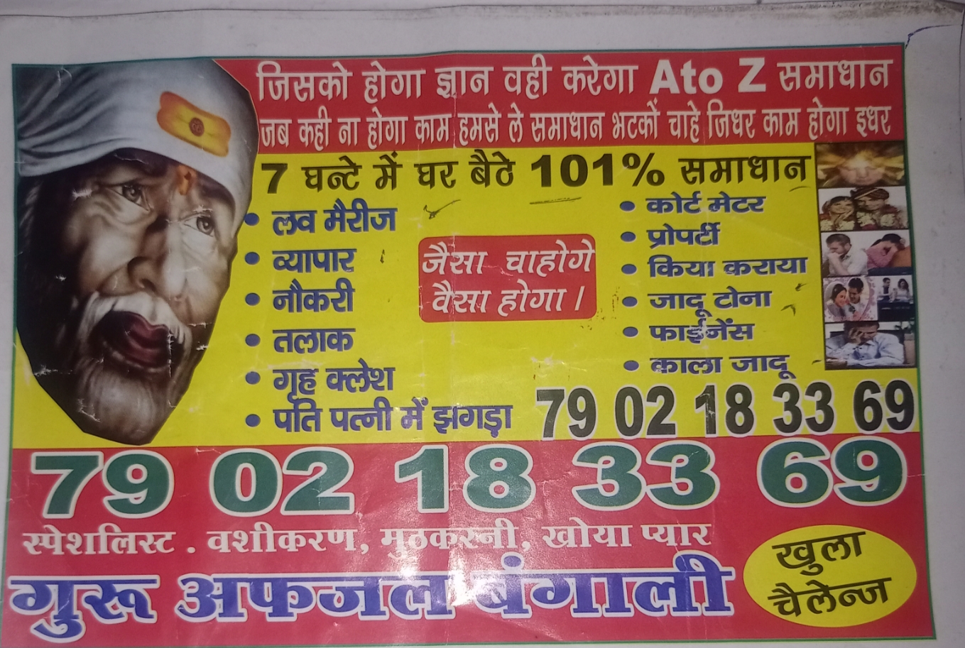 आजच्या धावपळीच्या युगात माणसाच्या गरजा जितक्या वाढल्या आहेत, तितकीच त्याच्या मनातील भीती आणि असुरक्षितताही वाढली आहे. याच भीतीचा फायदा घेण्यासाठी सध्या गल्लीबोळांपासून ते सोशल मीडियापर्यंत फसव्या जाहिरातींचा सुळसुळाट झाला आहे. वरील छायाचित्रात दिसणारी ‘गुरू अफझल बंगाली’ यांची जाहिरात याचेच एक जिवंत उदाहरण आहे. ७ तासांत १०१% समाधान, वशीकरण आणि कोर्टाच्या प्रकरणांत यशाचे आमिष दाखवून सर्वसामान्यांच्या खिशावर दरोडा टाकण्याचा हा एक संघटित प्रकार समोर येत आहे. पत्रकारितेच्या माध्यमातून जेव्हा आपण या दाव्यांची चिरफाड करतो, तेव्हा यामागील धोके आणि भोंदूगिरीचे भयानक वास्तव उघड होते.